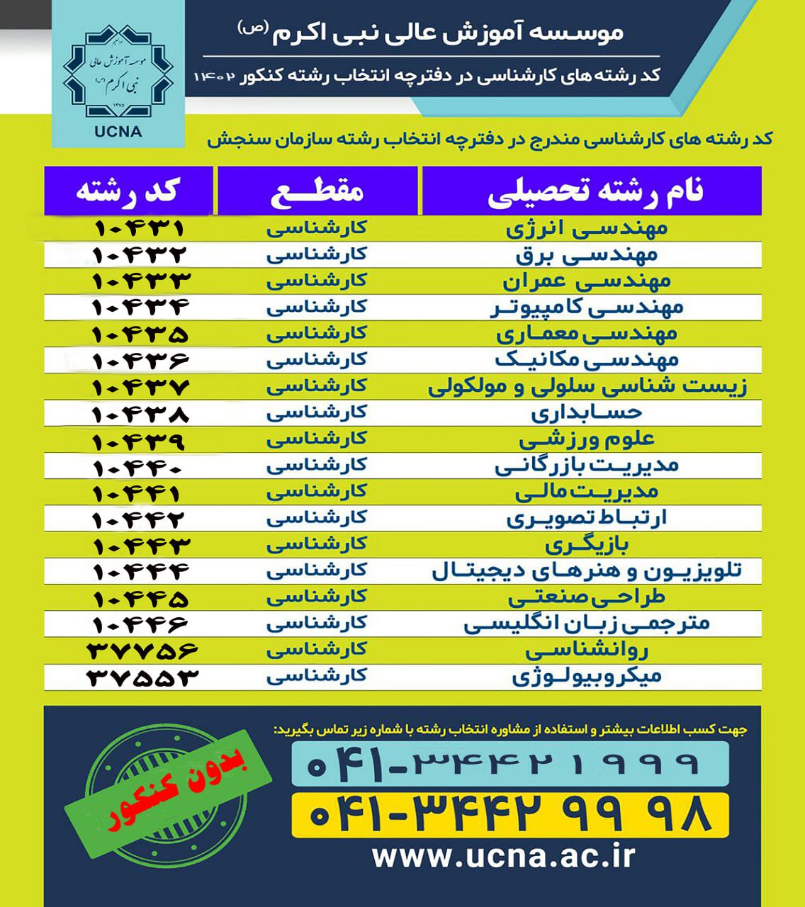 بر اساس اعلام سازمان سنجش آموزش کشور، پذیرش دانشجو بر اساس سوابق تحصیلی بهمنماه 1402 بصورت اینترنتی و از طریق سایت سازمان سنجش از روز سهشنبه به تاريخ 1402/11/03 آغاز و تا روز يکشنبه به تاريخ 1402/11/08 ادامه خواهد داشت. لازم به توضیح است دفترچه راهنمای ثبتنام و انتخابرشته حاوي شرايط و ضوابط پذيرش دوره مذکور از روز دوشنبه به تاريخ 1402/11/02 از طریق درگاه اطلاعرسانی سازمان سنجش قابل دسترس خواهد بود. لذا متقاضیان محترم میتوانند جهت کسب اطلاعات بیشتر در خصوص رشتهها و شرایط ثبتنام در این موسسه آموزش عالی با شمارههای ( 8 - 04134429990 ) تماس حاصل نمایند.